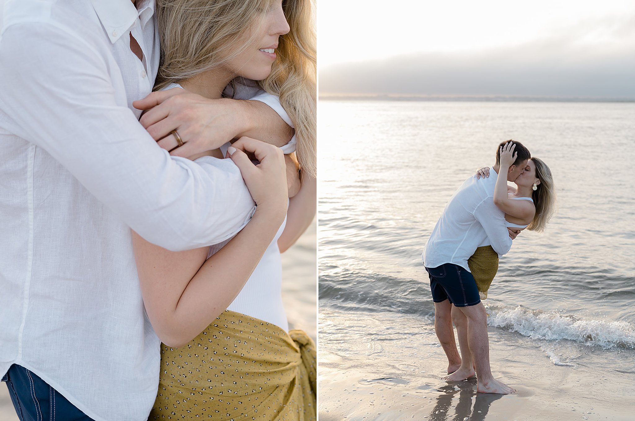 We love couples that are down to hop into the water during their sessions, and Kate & Brad did just that! We started this Ocean City engagement session on the beach at sunset. The golden light was so dreamy, as always, making for the most romantic of moments between these two. Their outfit picks were giving us “September on the coast” vibes, but summer wasn’t over just yet.