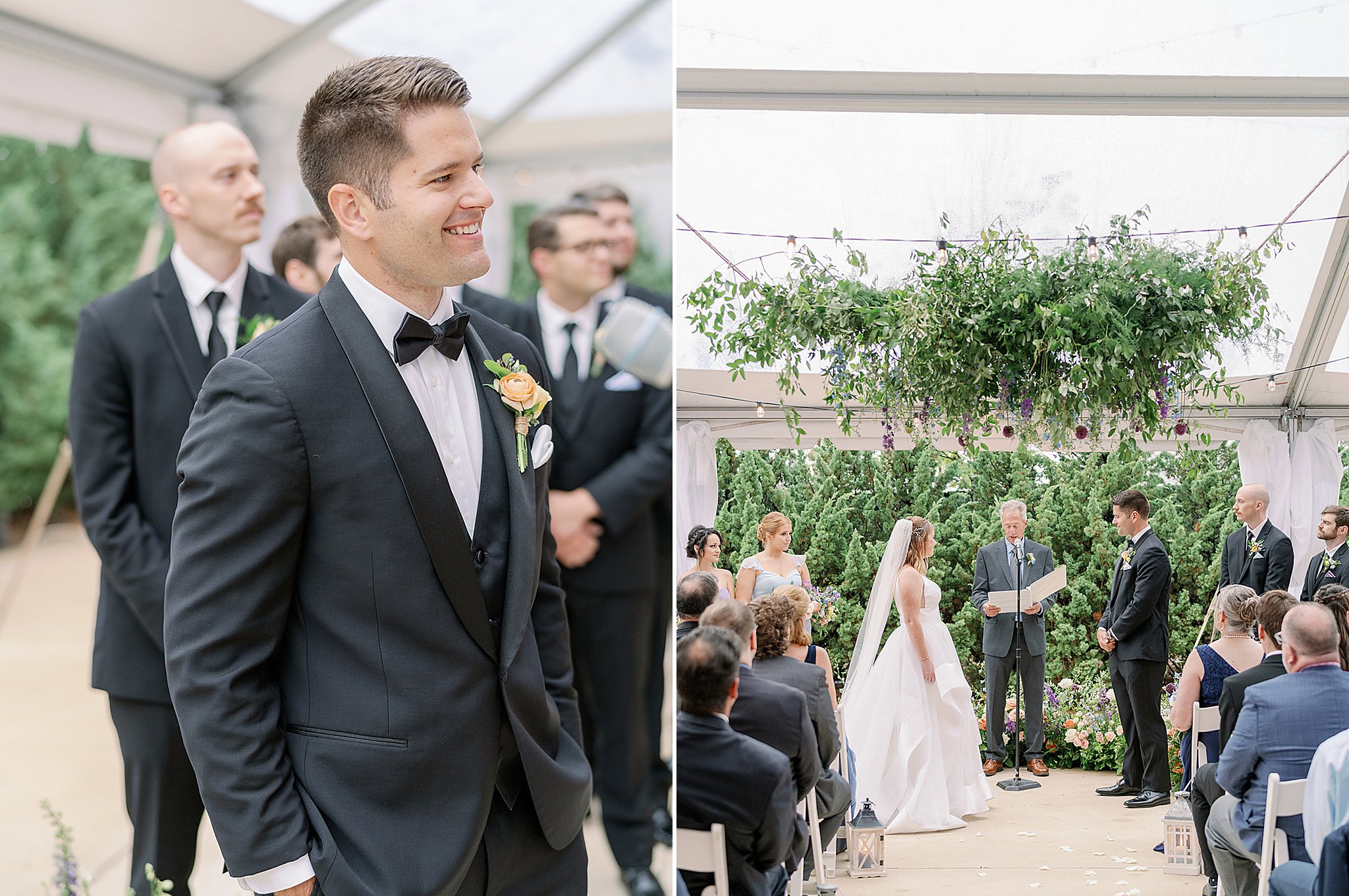 During bridal party portraits, the color palette came to life! The bouquets from Amber and Earth paired perfectly with the mix-and-match bridesmaid dresses. Kristen & Steve’s puppy made a special appearance during bridal party photos and it was the best! (Here are our best tips for including your dog in your wedding!) The ceremony took place under a hanging greenery arrangement, giving the space a secret garden feel. The reception was set under a transparent tent and filled with greenery and florals. The dining tables were arranged with the most gorgeous details!