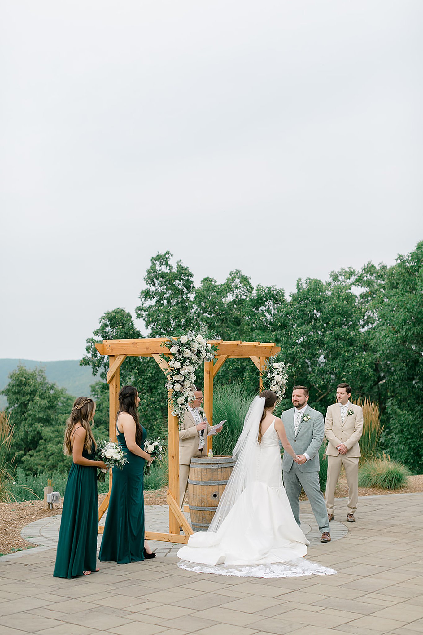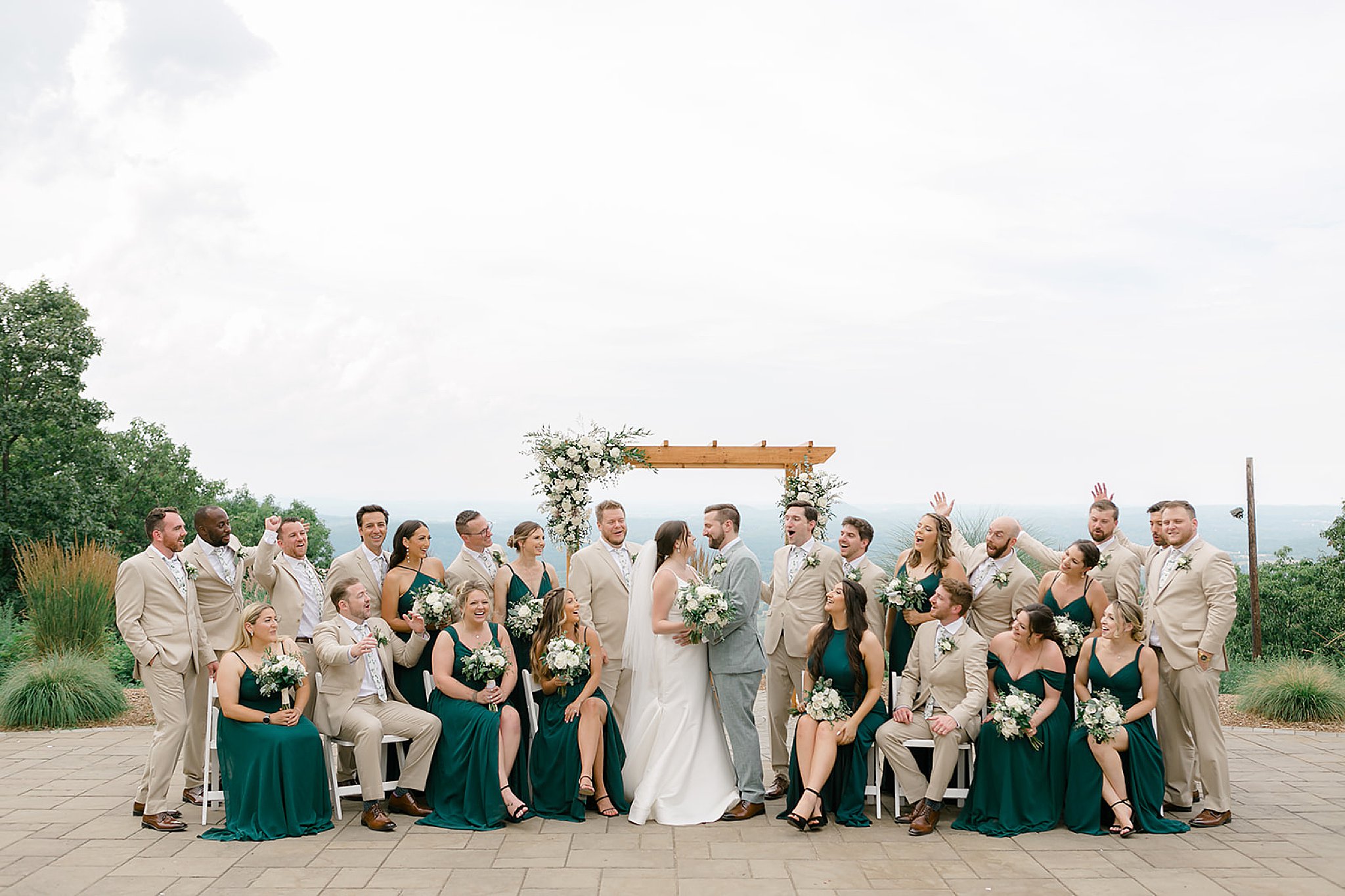 The only way up and down the mountain is by ski lift, how cool is that!? The ceremony space had an epic view of the valley and mountain ranges in the distance. It was an amazing spot for portraits! Michele’s bridesmaids rocked emerald green dresses from Azazie and the groomsmen picked off-white suits from Generation Tux.