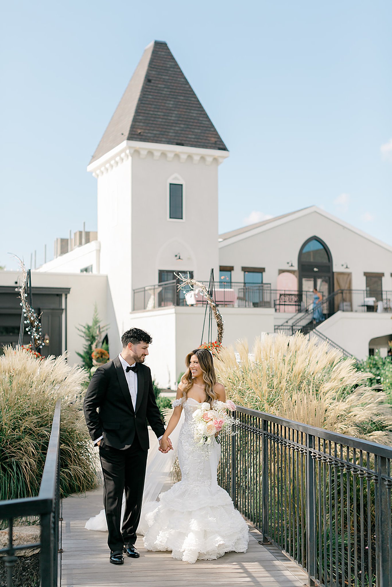 They chose Renault Winery Resort as their New Jersey wedding venue because of the beautiful outdoor ceremony space and the rustic warm feeling in the ballroom. Ariel got ready in the bridal suite at the ballroom and popped outside onto the ballroom deck to pop champagne and hang out in the chic lounge. The couple shared their first look in the ceremony space underneath their gorgeous floral arch.