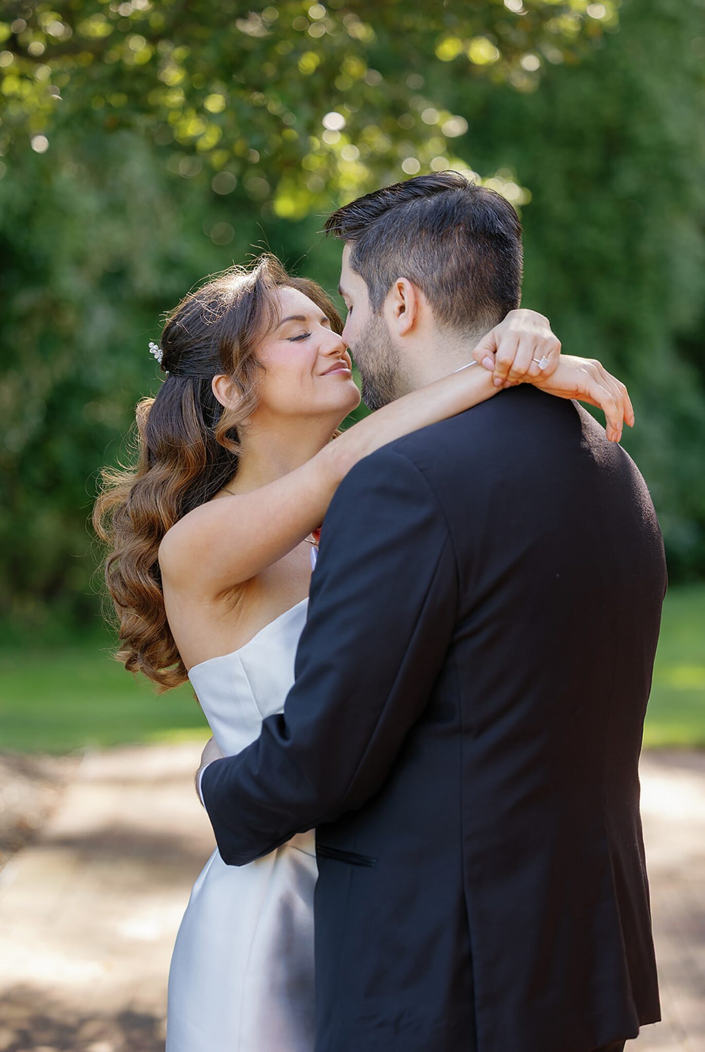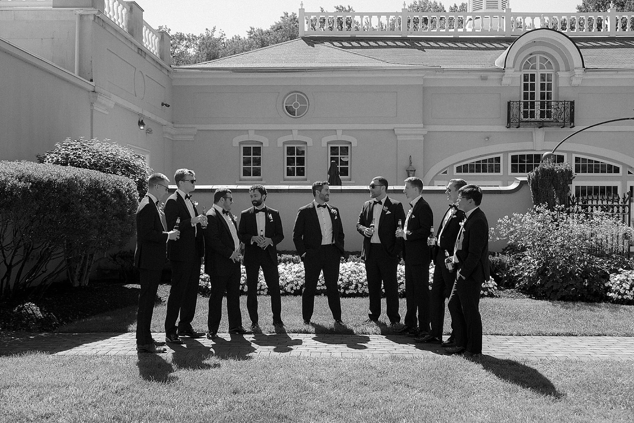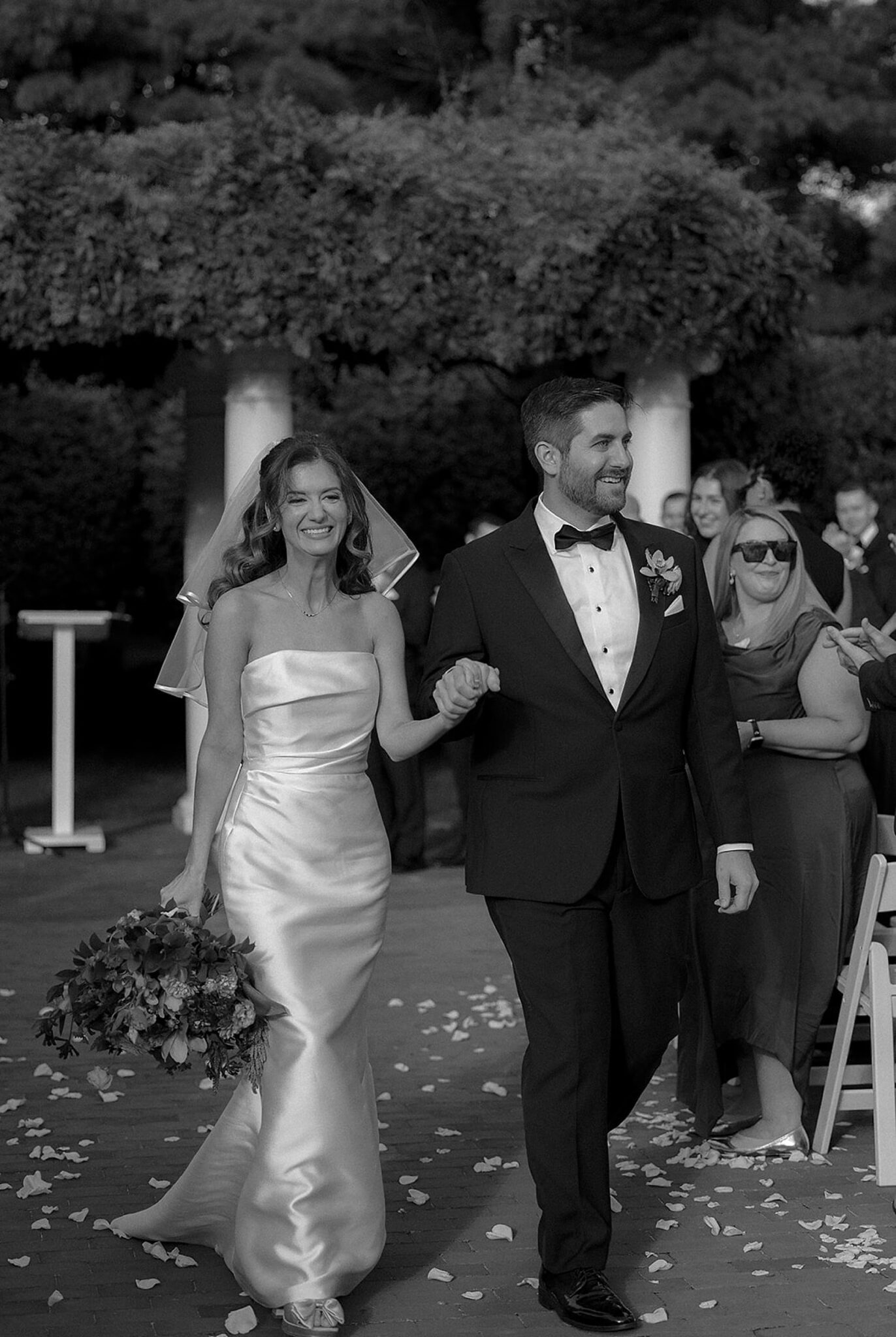Before the wedding ceremony, we explored the property for portraits. The sun was shining bright, highlighting the vibrant summer tones across the gardens and architecture of Pen Ryn Estate. Catherine and Stephen’s outdoor ceremony was filled with joy, and their exit beneath a shower of petals was one of our favorite moments of the day. As the sun began to set, the celebration continued inside the ballroom of Belle Voir Manor. Guests gathered under sparkling chandeliers as the newlyweds danced, toasted, and celebrated their love surrounded by family and friends.