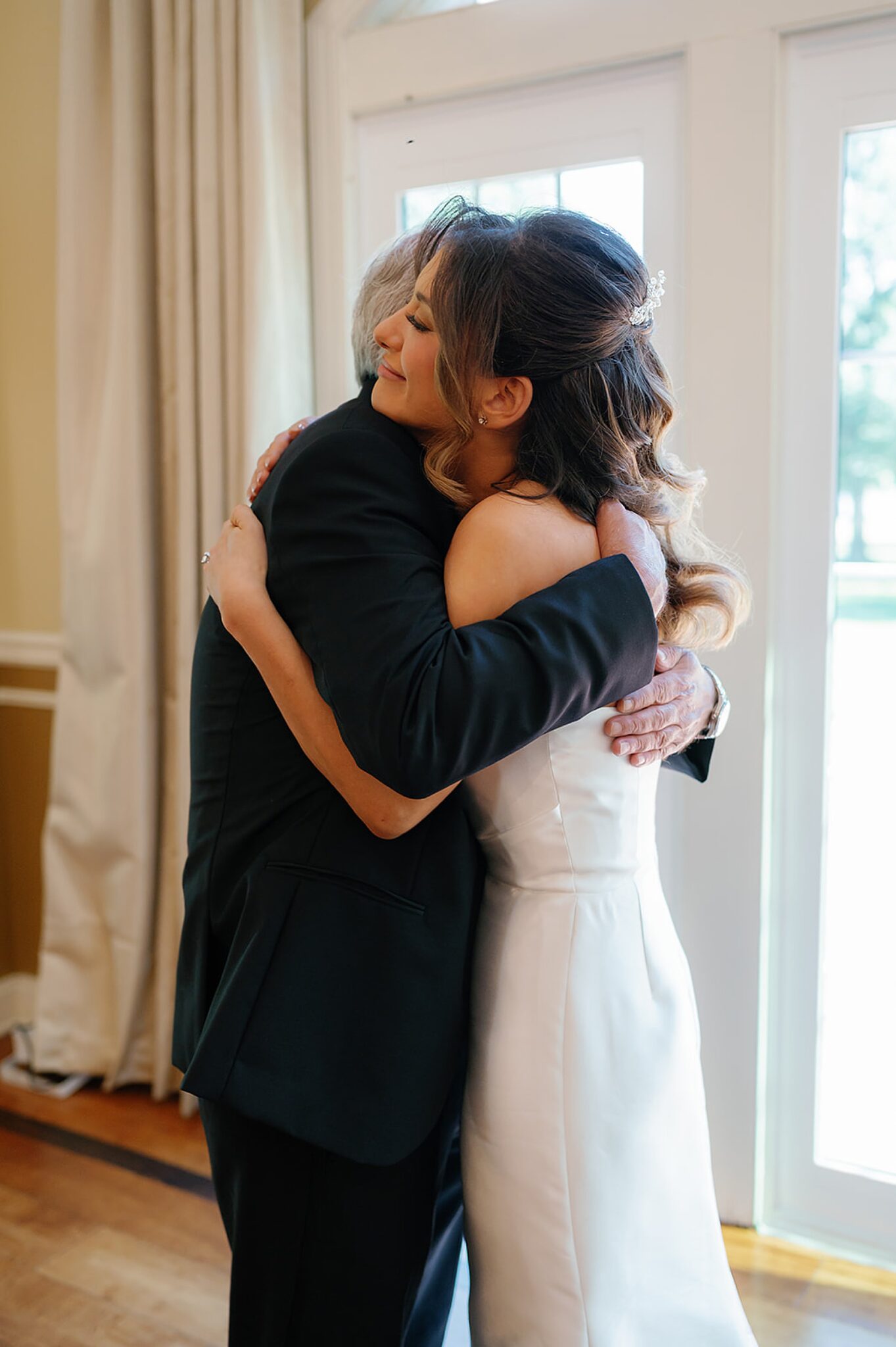 Catherine and Stephen’s August wedding at Pen Ryn Estate’s Belle Voir Manor was timeless, vibrant, and full of love. This historic riverfront venue is stunning, and on this sunny summer day, it was glowing with color and light. Catherine began her morning getting ready on site with her bridesmaids and mom by her side. The energy in the room was joyful as she slipped into her gown and added the finishing touches to her bridal look. Before heading out to meet her groom, she shared a heartfelt first look with her dad, such a special moment to witness and capture!