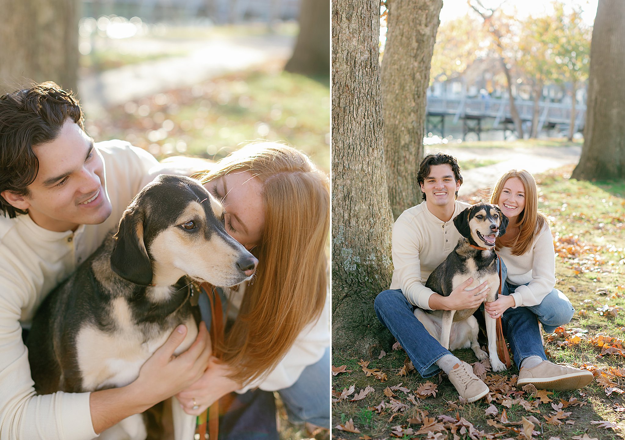 Paxton & Brian’s Jersey Shore engagement session was so dreamy! It started in a park in Spring Lake, NJ among the Autumn leaves. The colors were so vibrant on this sunny November day! The couple brought the sweet fur baby Bella with them. It’s always so much fun when couples include their pups in their portraits and wedding photos. We strolled around the park for a bit, making use of all the gorgeous scenery around the lake.