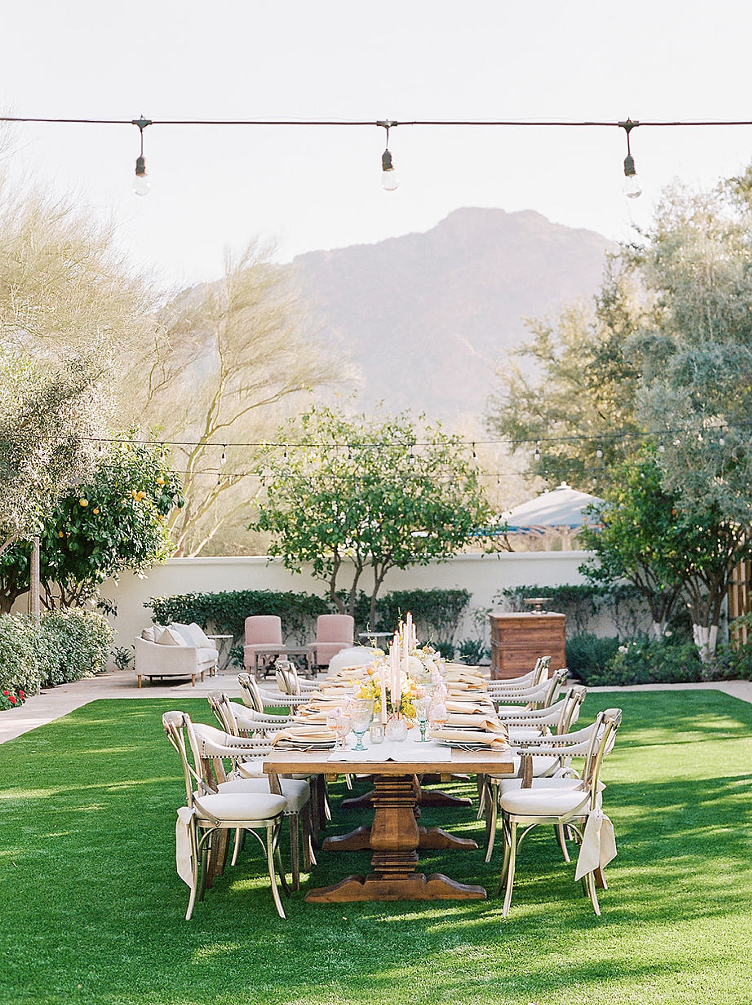 This stunning summer El Chorro wedding took place in Paradise Valley, Arizona. It was designed to perfection by Desert Whim and photographed on film by Magi Fisher of Magdalena Studios. The colorful florals by Form Floral reflected the vibrance of the desert and the lace bridal gown from BHLDN brought a bohemian feel to the day. The outdoor ceremony in the courtyard was perfection, with loose floral blooms circling the couple while they said “I do.” The reception space at this El Chorro wedding featured an al-fresco, family-style dining table and a view of the surrounding mountains. It was a dream working with this talented team of vendors! Be sure to check them out, all linked below. We cannot wait to work with them again in the future!