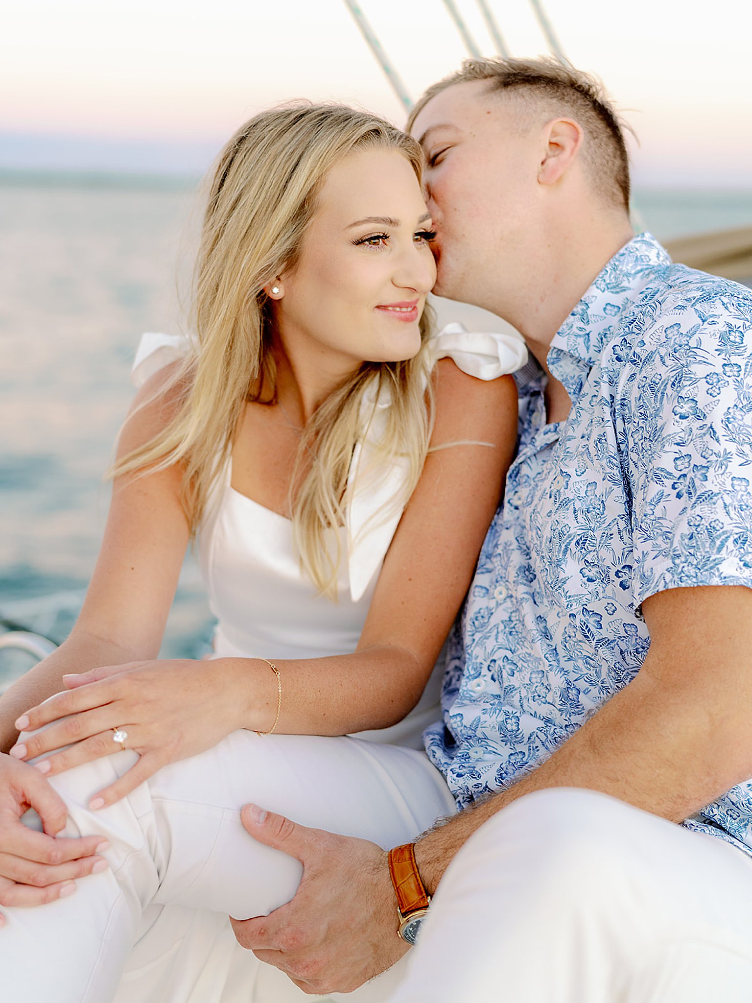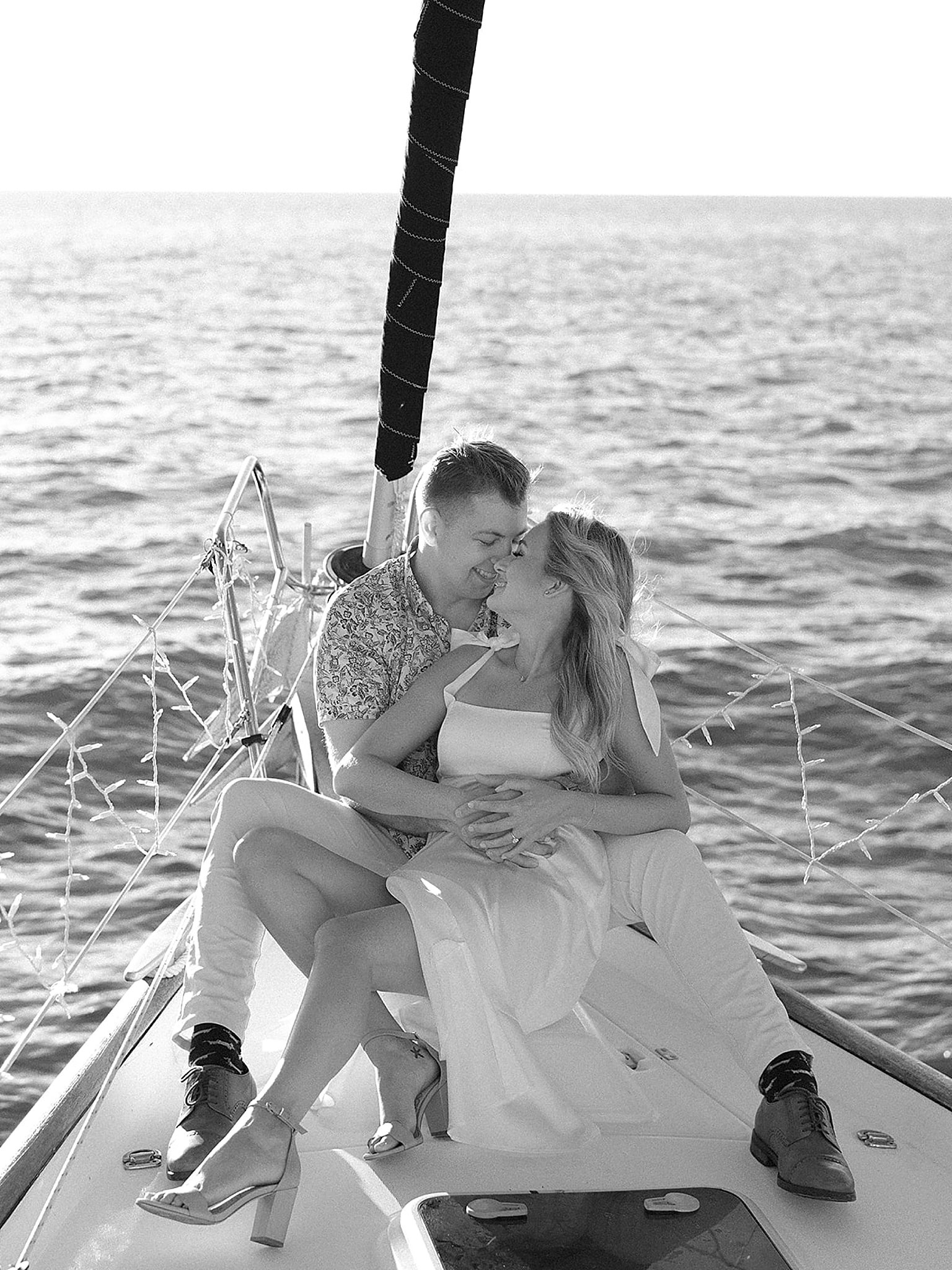 We’re still swooning over Sarah & John’s destination sailboat engagement session! Fun fact: Sarah is the sister-in-law of Magdalena Studios founder, Magi Fisher. We feel so lucky to get to photograph our family & friends. The session took place in Marco Island, Florida, where the couple’s families have homes. They rented a sailboat for a sunset cruise, where their family & friends joined them in celebrating. Sarah & John cuddled up on the front of the boat and popped champagne as the sun dropped over the horizon.