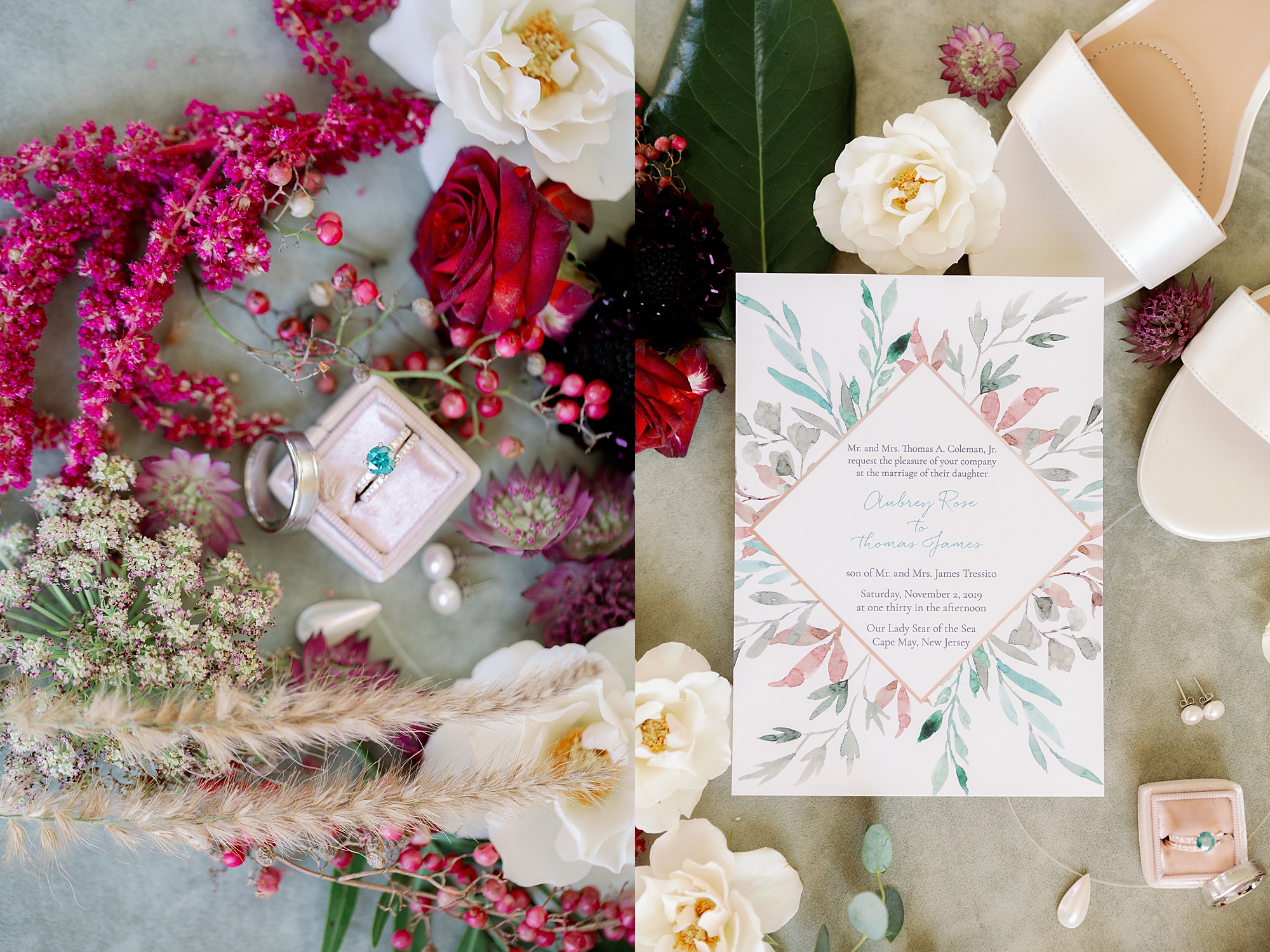 If you’re looking to get married in Cape May, you need to check out this whimsical and rustic Cape May winery and vineyard. Willow Creek was the perfect setting for this Winter wedding. The colors fit the season perfectly, from Aubrey’s blue diamond engagement ring, to the red & green florals, to the deep blush bridesmaid dresses! Aubrey’s rocked a white flower crown which added an element of boho whimsy. The days are shorter in November, but that worked in Aubrey & Tom’s favor, as their mid-afternoon portraits on the beach were full of golden light! The ballroom was so cozy, adorned with greenery and candles. Aubrey and Tom danced the night away beside their family and friends on this magic winter day!